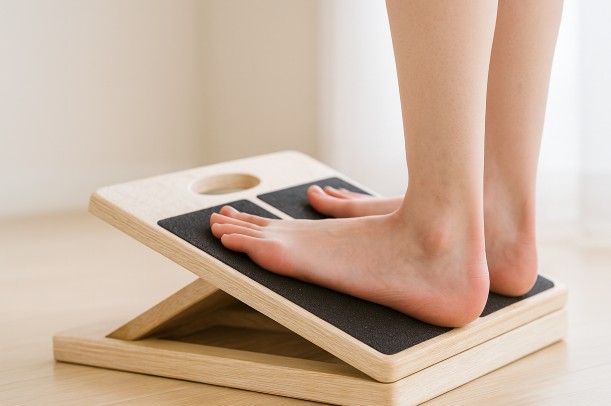 ストレッチボードに立つと、足首が一定の角度で曲がった状態になります。この姿勢により、ふくらはぎ全体が均等に伸びやすくなると言われています。自分でバランスを取る必要が少ないため、余計な力が入りにくく、伸びる感覚に集中しやすい点が特徴とされています。