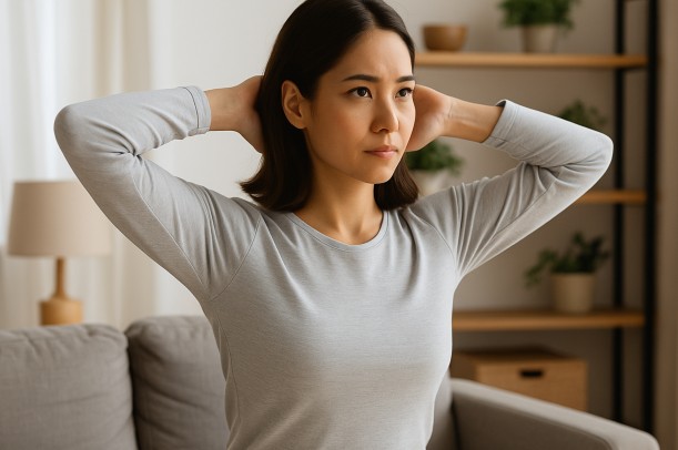 たとえば、首をゆっくり前後左右に倒すだけでも、筋肉をほぐす助けになります。