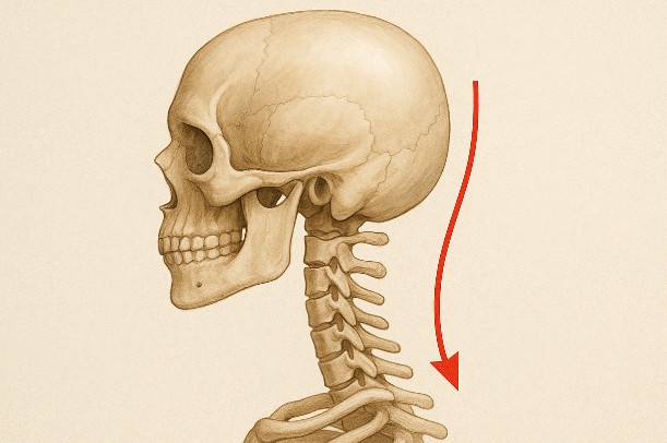 また、長期間の猫背姿勢によって背骨全体のカーブが崩れると、首の自然なS字カーブ(頸椎前弯)が減り、「ストレートネック」状態になっている場合もあります。