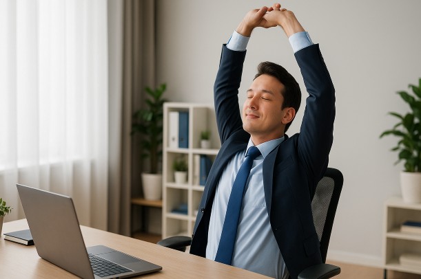 一日の中で何度か「背伸び+深呼吸」を行うと、全身の姿勢リセットにも効果的です。