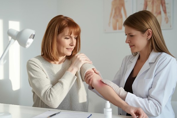 受診先としては、まず整形外科・皮膚科・内科などが挙げられます。