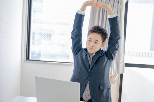 1時間に1回は立ち上がって軽く伸びをしたり、肩を回すなどして筋肉をリセットしましょう。