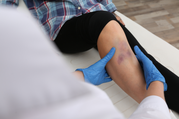 「打撲」とは、体の一部を強くぶつけたり押されたりして、筋肉・皮下組織・血管といった軟部組織が損傷を受けた状態を指すと言われています(医療法人社団広恵会 春山記念病院)医療法人社団広恵会 春山記念病院。衝撃によって毛細血管が破れて出血し、その血液が皮下に滲むことで「内出血」が起こります。見た目には紫色や赤紫色のあざができたり、腫れたりするのがその証拠です。最初は痛みがなかったり軽く感じたりしても、時間をおいて症状が進むこともあります(RehaSaku 解説)リハサク