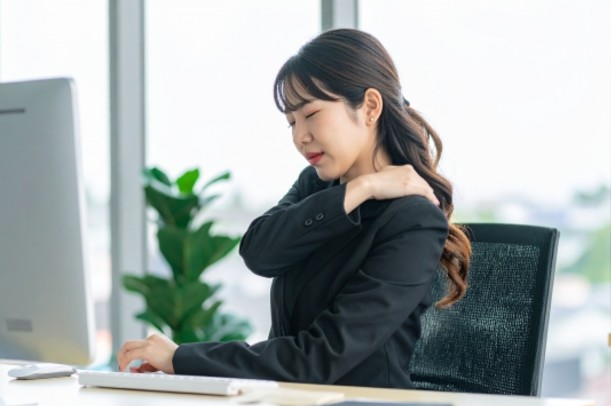 肩甲骨まわりの筋肉が固まりやすい背景には、日常生活のクセが大きく関わると言われています。とくにデスクワークの姿勢は影響が強く、肩が前へ出た状態が続くと肩甲骨が外側へ広がり、背中の筋肉が働きにくい状態になりやすいと説明されています。参考記事でも、姿勢が丸まる時間が長いほど僧帽筋や肩甲挙筋に負担が偏り、筋肉が緊張しやすいと紹介されています(引用元:https://kumanomi-seikotu.com/blog/3212/ )。この状態が続くと、肩甲骨の動きが小さくなり、気づいたときには固さが定着していることもあると言われています。