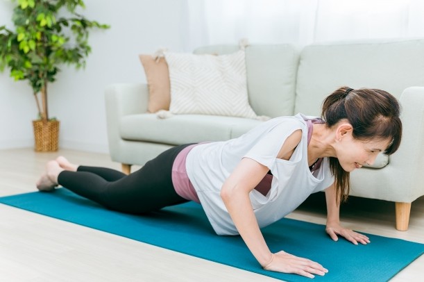通常の腕立て伏せが難しい人は、膝をついて行うことで負荷を減らせます。