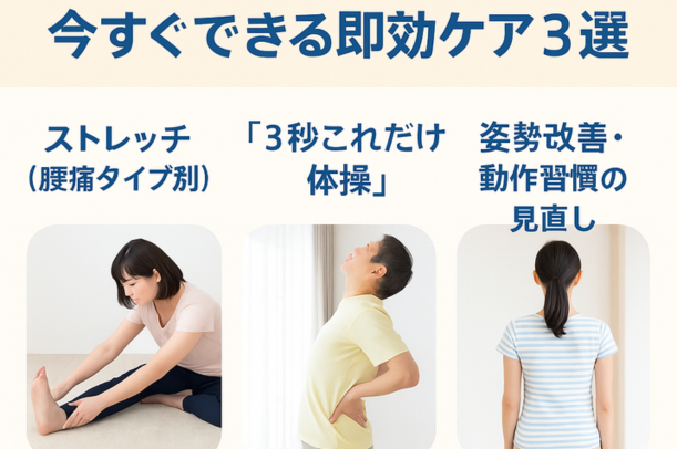軽度であればストレッチや「3秒これだけ体操」といった簡単な方法が役立つとされ、正しい姿勢の維持や体幹の筋力強化が予防につながると考えられています。さらに、セルフケアで改善が見られない場合や「レッドフラッグ」のサインが出ているときは、専門家に相談することが安心への近道だとされています(引用元:https://www.karakoto.com/64879/)。