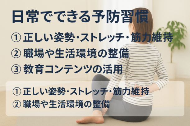 #腰痛予防 #正しい姿勢 #ストレッチ習慣 #筋力維持 #生活環境