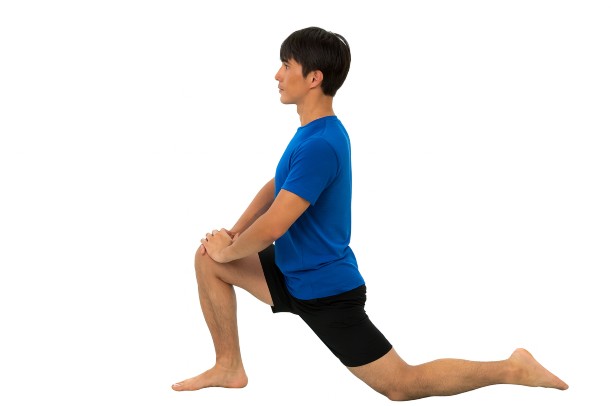 床に片膝をつき、前に出した脚へ体重をじわっと移す方法です。太ももの付け根が軽く伸びる位置を探して、呼吸を止めずに続ける形がすすめられています。