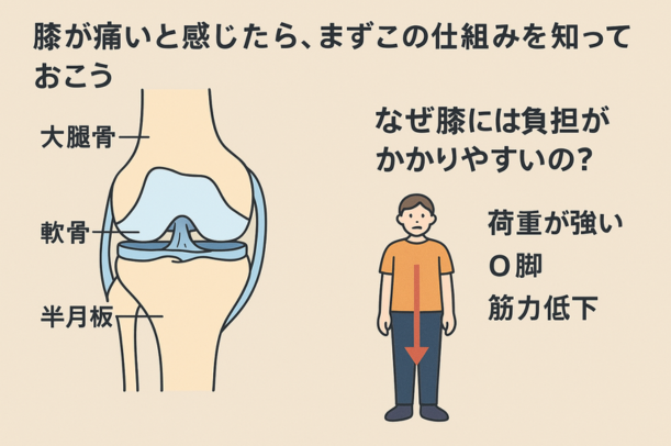 「膝が痛い…」と思ったら、こうした構造とメカニズムをまず知ると、「なんとなく不安」から「そういうことだったのか」と理解が深まって、ちょっと安心できますよね。