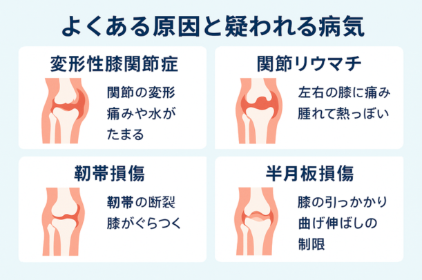 「膝が痛いって言っても、人によって原因が違うんじゃない?」と聞かれることがあります。まさにその通りで、代表的な病気はいくつかあるんです。ここでは特徴や来院の目安を整理してみましょう。