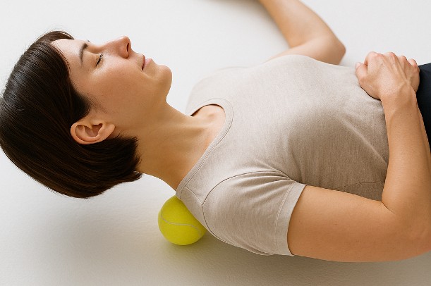 菱形筋の深いコリにアプローチする方法として、テニスボールを使ったほぐし方は定番と言われています。肩甲骨と背骨の間にボールを当て、仰向けになって体重をゆっくりかけると、指では届きにくい深層にまで圧が届きやすいと説明されています(引用元:https://stretchex.jp/5827 )。