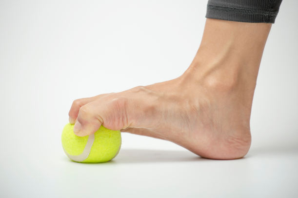 ストレッチと合わせて、足裏や指の付け根を軽くもみほぐすのも有効とされています。手で圧をかける方法だけでなく、ゴルフボールを床に置いて足裏で転がす方法もよく知られています。こうした刺激は血流を促す一助になると考えられています。