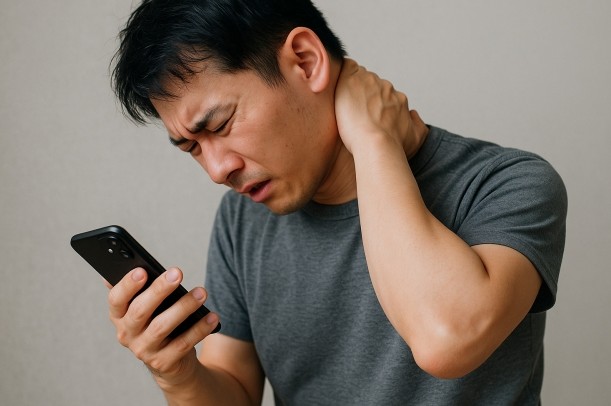 首の後ろが痛いと感じる場面では、日常の姿勢が影響しやすいと言われています。特に、スマートフォンを見るときに顔が前へ出やすく、首の後ろ側が引っ張られた状態が続きやすいと説明されています。この姿勢が習慣化すると、首周囲の筋肉がこわばりやすくなるとも語られています(引用元:https://kumanomi-seikotu.com/blog/6872/ )。
