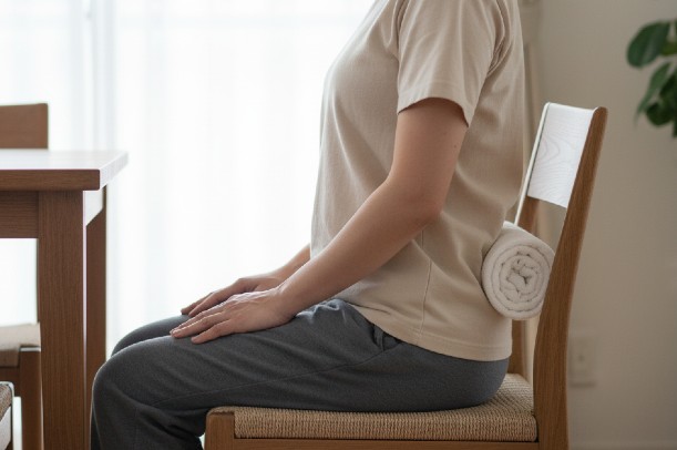 椅子に座るときは、骨盤を立てて背筋をまっすぐ伸ばすことが基本。腰の後ろに小さなクッションやタオルを当てると、自然なS字カーブを保ちやすくなります。